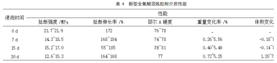 表3显示,新研制的FFKM混炼胶在常温拉伸强度与断裂伸长率上优于其他混炼胶,表明其力学性能突出。同时,高温压缩永久变形显著降低,能在280℃下稳定使用,展现出卓越的高温性能。表4则证实了其优异的耐介质性能,达到一级相容标准。氟橡胶产品