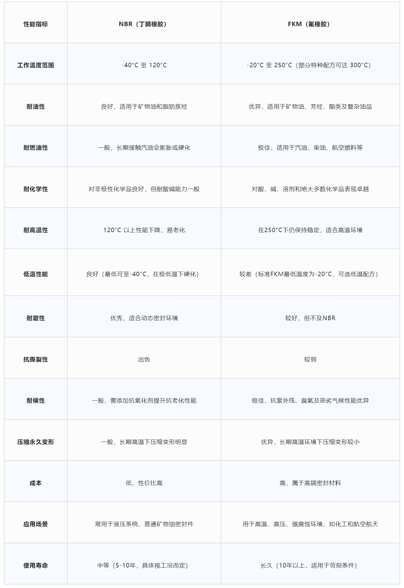 选择FKM的条件:工作温度超过120°C,暴露于燃油、芳烃、强酸、强碱等化学品,需要长期稳定的性能(如10年以上使用寿命),应用于航空航天、化工等高端行业。