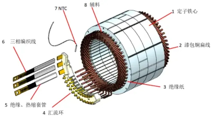 扁线电机:采用矩形截面的铜线绕组,提升槽满率约30%,实现更高功率密度和效率,已广泛应用于比亚迪、大众、特斯拉等品牌车型;