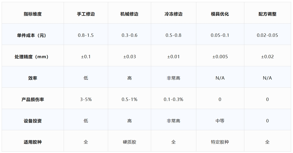 常规制品:采用“精密模具(间隙≤0.01mm)+冷冻修边(-150℃×10min)”组合方案,可实现单件综合成本0.3-0.5元,满足汽车行业≤0.05mm飞边标准。