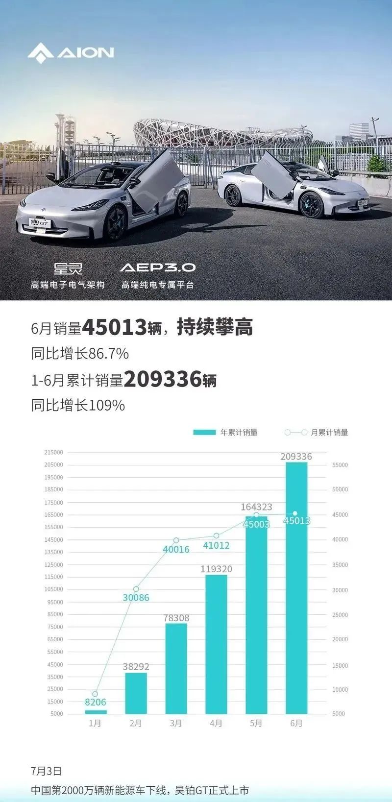 广汽埃安公布最新销量成绩。2023年6月销量45013辆,同比增长86,7%。2023年1-6月累计销量209336辆,同比增长109%。 樱花模板下载。